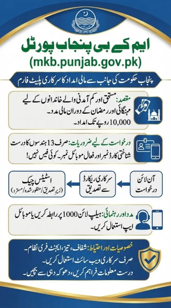 The MKB Punjab Portal (mkb.punjab.gov.pk) is an official Punjab Government platform launched to provide up to PKR 10,000 financial assistance to deserving families facing economic hardship. Citizens can apply online using their 13-digit CNIC and active mobile number without paying any fee or visiting government offices.